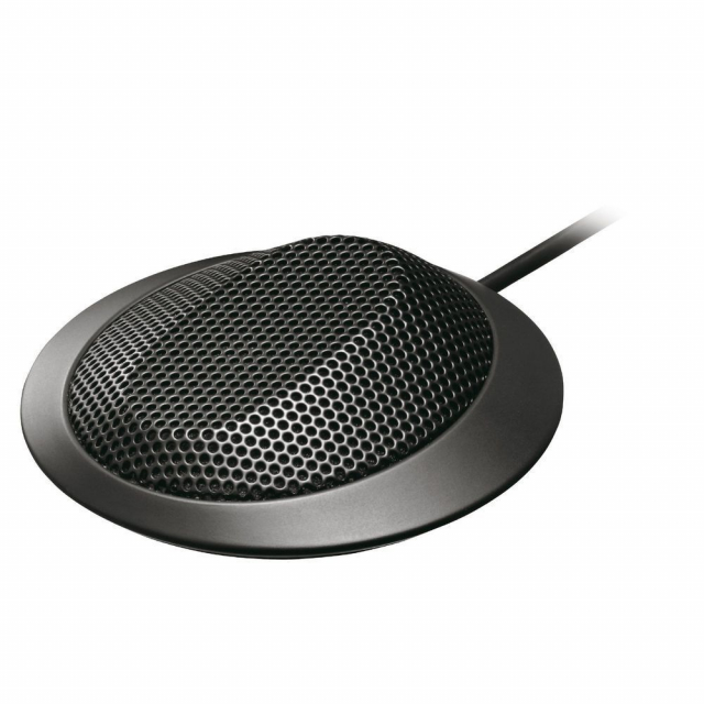 The low-profile boundary microphone shall be designed to be placed on a flat surface for sound pick-up applications, and have an electret condenser microphone element with a cardioid polar pattern that rejects off-axis sound, for focused pickup. Frequency response shall be 35 Hz to 20 kHz. Rated impedance shall be 120 ohm, balanced, and rated sensitivity shall be -33 dB (1 kHz 0 dB=1 V/Pa). A low cut filter switch (100 Hz, -12 dB/oct) shall minimize ambient noise interference. The microphone shall be powered by any phantom power source supplying 9 - 52 volts.The output connector shall be XLR-3-12 equivalent, and cable length shall be 7.5 m (24.61 ft.). Operating temperature shall be 0° C to +40° C (32° F to 104° F). Body finish shall be die-cast aluminum, and punched net surface-treated shall be steel plate, both with black matte-finish paint. Dimensions shall be 83 (W) x 23 (H) x 83(D) mm (3.27" x 0.91" x 3.27") (excluding cord), and weight shall be 290 g (0.64 lbs.). The microphone shall provide pure, natural sound quality, and be ideally suitable for installation on a lecture desk or meeting room table-top.