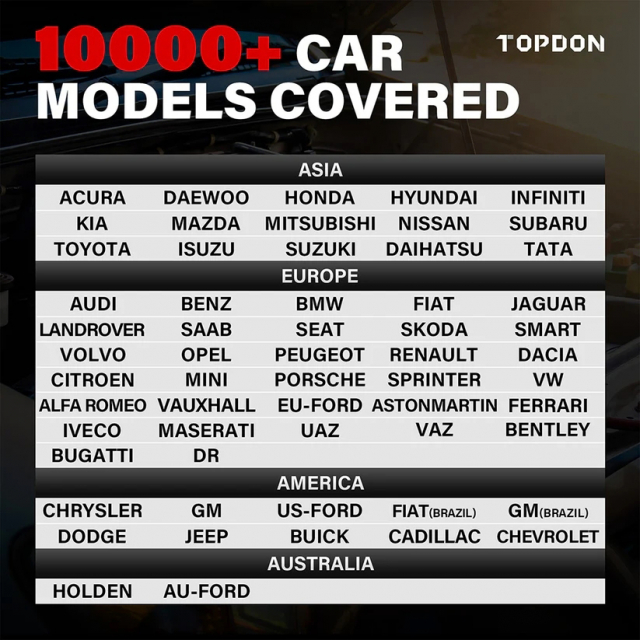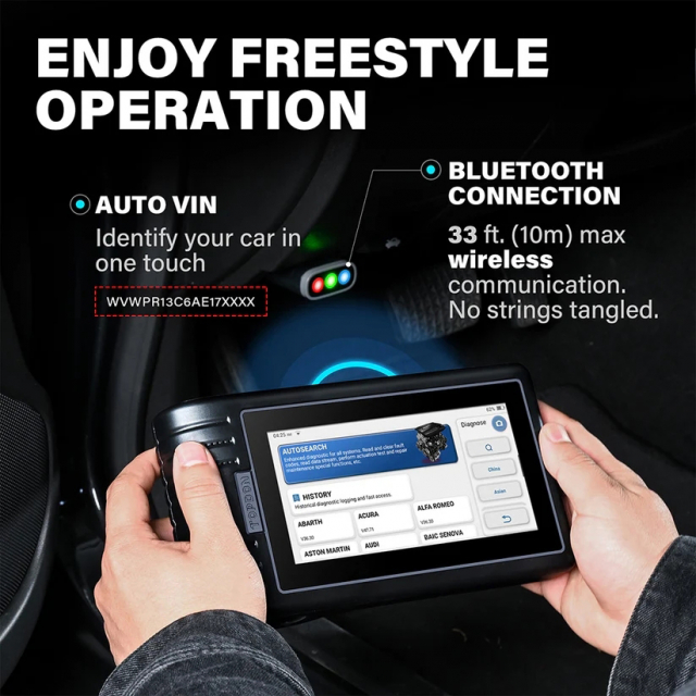 - All System Diagnostics: Supports full system diagnosis for 96 brands, including Engine, Transmission, Airbag, ABS, ESP, TPMS, Immobilizer, Gateway, Steering, Radio, Air Conditioning, and more.