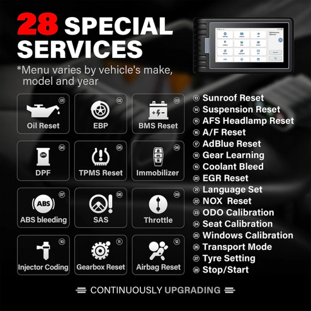 - 28 Maintenance Services: Offers services like oil light reset, throttle matching, SAS calibration, DPF reset, and more. Brand coverage is regularly updated.