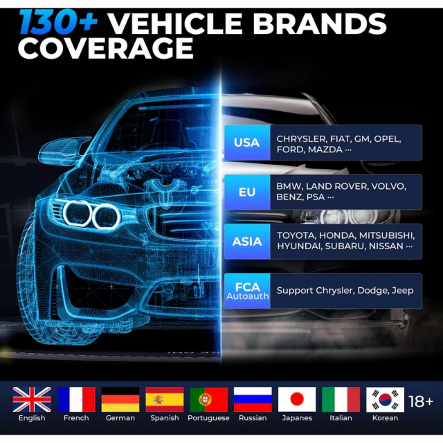 - Performs comprehensive scans on over 130 brands including BMW, BENZ, JAGUAR, CHRYSLER, FIAT, GM, FORD, HONDA, and more.