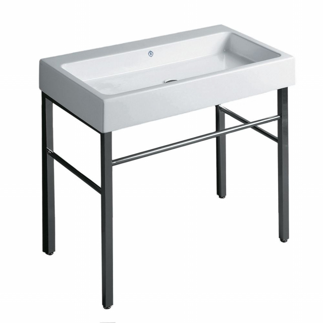 This large rectangular console sink with polished chrome legs and center drain is in a choice of no hole drill, single faucet hole, or 16" widepread hole drill will complement your ideal design perfectly.