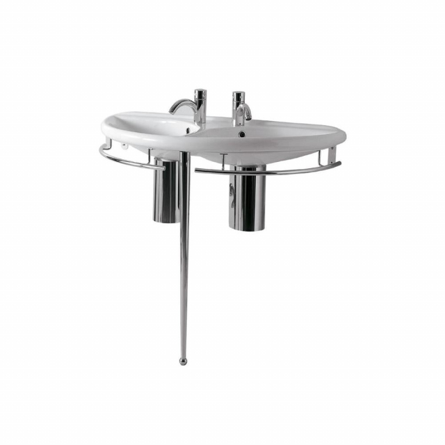 Whitehaus Collection displays high levels of sophistication and serenity with The Isabella Collection. Made from the highest quality vitreous china, create a modern yet refined feel to complement any decor with this semi-circular double basin china console with chrome overflow, polished chrome towel rails and leg support.