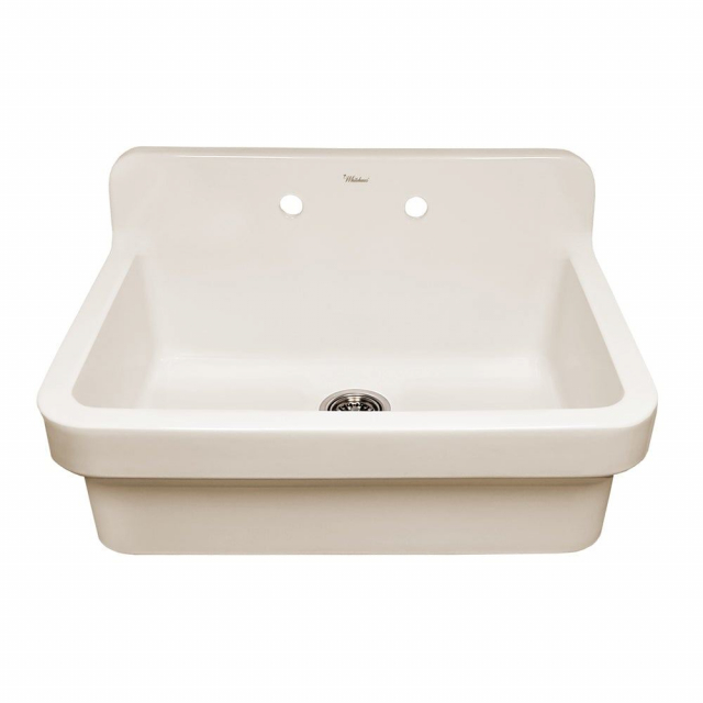 Generous in size and style, the solid Old Fashioned Country fireclay kitchen sink has a high backsplash and 8" pre-drilled holes for a wall mount faucet.