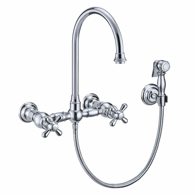 Vintage III Plus by Whitehaus Collection offers the finest craftsmanship and style that leaves a lasting impression in your kitchen. Designed to complement any home, Vintage III Plus kitchen faucets are made of solid brass that ensures durability and strength. This wall mount faucet features a long gooseneck swivel spout and solid cross handles. The durable solid brass side spray with its hose in the same finish as the faucet and side spray is the perfect final touch. Vintage III Plus has the advantage of being Watersense compliant with 1.5 GPM water flow. Allow the unique elegance of a Vintage III Plus faucet to become the centerpiece in your home.
