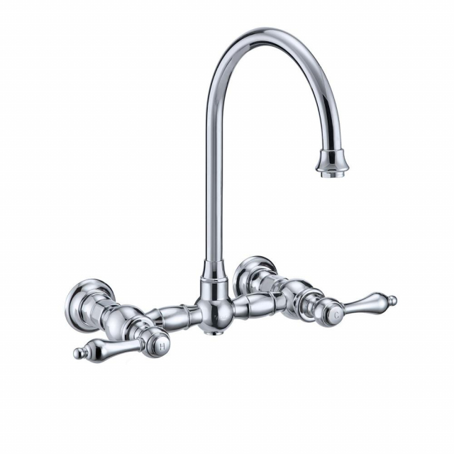 Whitehaus, WHKWLV3-9301-NT-C, Vintage III Plus Wall Mount Faucet with A Long Gooseneck Swivel Spout, Lever Handles and Solid Brass Side Spray