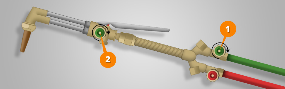 Turn the oxygen controller off when you close the acetylene controller and pull the oxygen measurement caliber out a few turns. After that turn the handle on the oxygen cylinder. The oxygen tap is double-seated, that is why be sure to turn the handle so the tap is entirely activated.