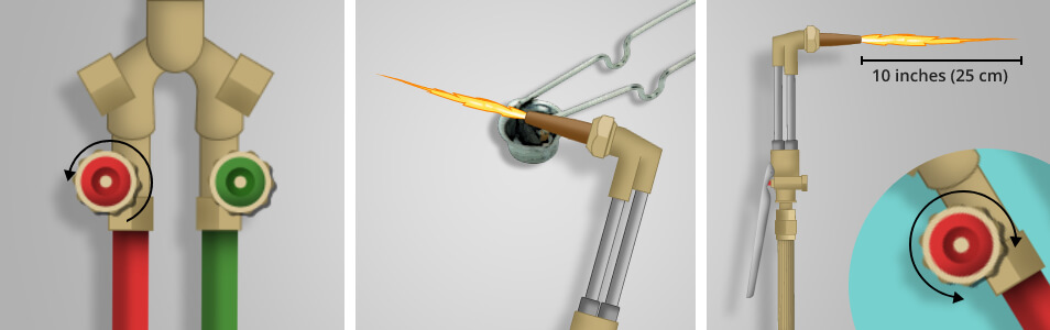 Activate and close the oxygen tap on the torch to release the air. There are two taps on the oxygen torch side. Firstly, activate the tap next to the hose. Then activate the forward tap and close when the hose is cleared out.