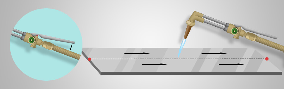 Press the cutting tap handle down to relieve the oxygen jet to torch the soft material. When the violent reaction starts, it means the material is soft and you can boost pressure until the jet cuts the material entirely. Start moving along the direction you marked with a marker for the cut. Cut until you have finished the cut or parted the needed material.