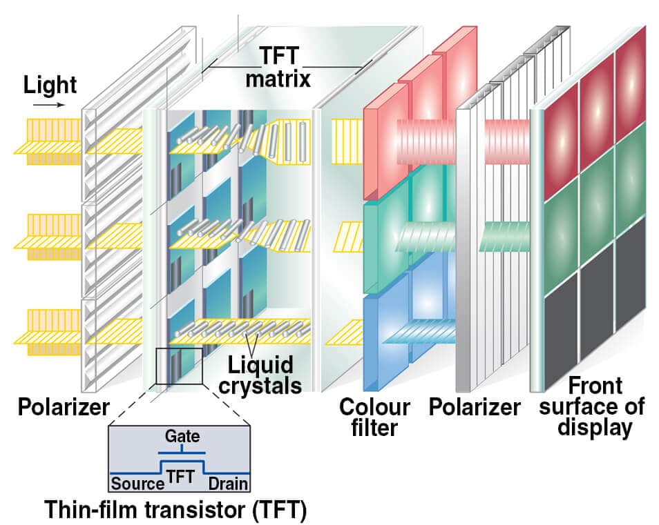 Almost any LCD display has an active matrix of transistors with the help of which an image is formed: a layer of liquid crystals with light filters that selectively transmit light and a backlight system that is used to display color images and usually consists of LEDs.