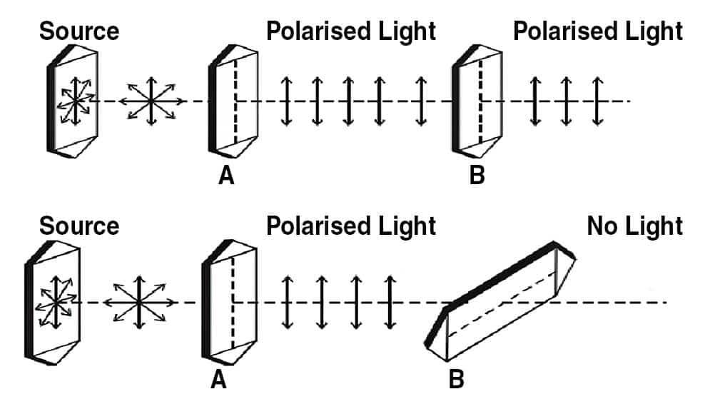 versa. This is how polarized sunglasses work by letting in light equal to their direction and plane.