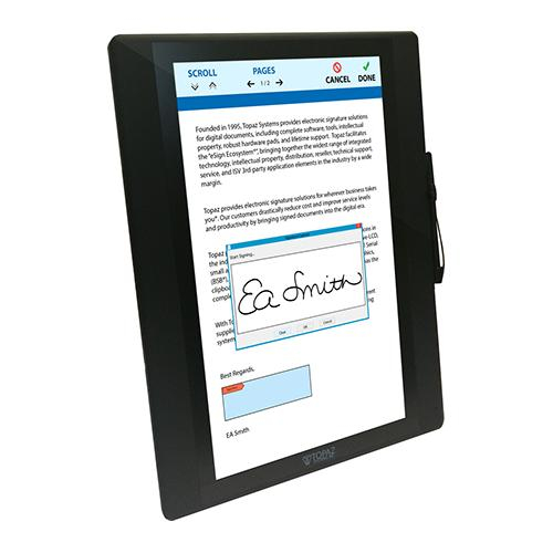 Comes bundled with Topaz software solutions for GemView, including apps for PDF creation, signing, and annotating (by the PC user, by a client in a one-on-one environment, and by multiple clients in a one-to-many environment), SDKs for development, and more. The LCD display allows users to see their signature while signing.
